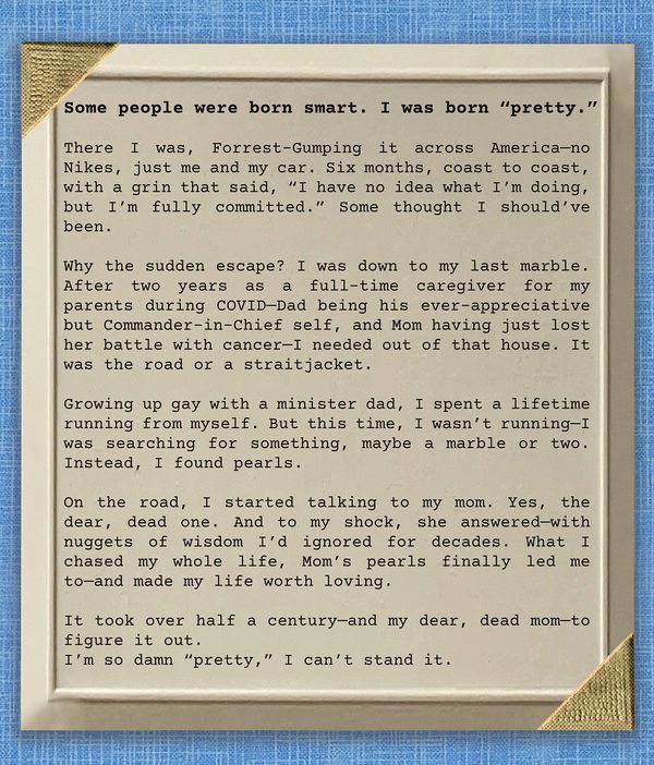 Here, the back cover highlights the pearls I gathered from Mom after she died. Inside, we walk through my life to see how those lessons completed the puzzle of the life I built, wrecked, and rebuilt.